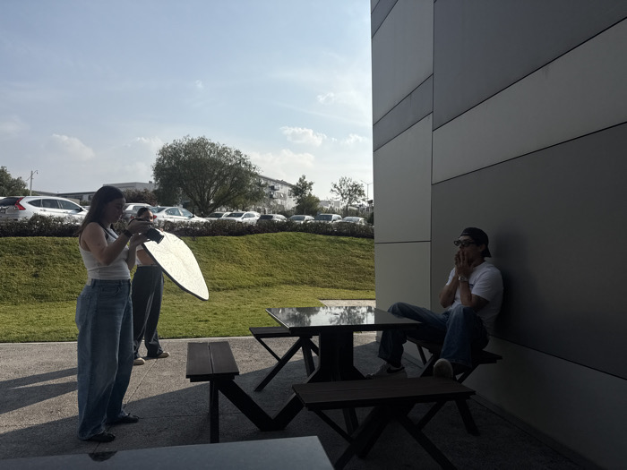 - "A person in jeans and a white tank top holds a reflector near a photographer" by FM-osCwy1, licensed under CC BY 4.0