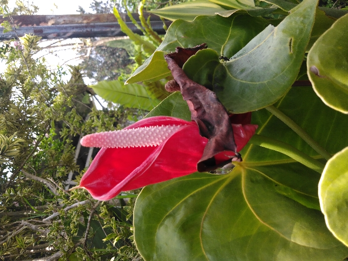 The scene is an outdoor botanical setting, located in El Rincón de Monagas, Venezuela. The primary subject is a single Anthurium flower, specifically a red spathe with a prominent, erect, light pink spadix displaying a granular texture. The flower is positioned centrally and slightly to the left. Surrounding the flower are multiple large, ovate, dark green leaves exhibiting visible venation. A single desiccated leaf, brown and shriveled, is observed resting on a larger green leaf directly below and to the right of the red flower. Additional green foliage, some with variegated lighter green and yellow patterns, forms the midground and blurred background. A vertical, dark-colored pole is visible on the right side of the frame, extending upwards. The lighting suggests natural daylight conditions. No human figures or discernible animal life are present.