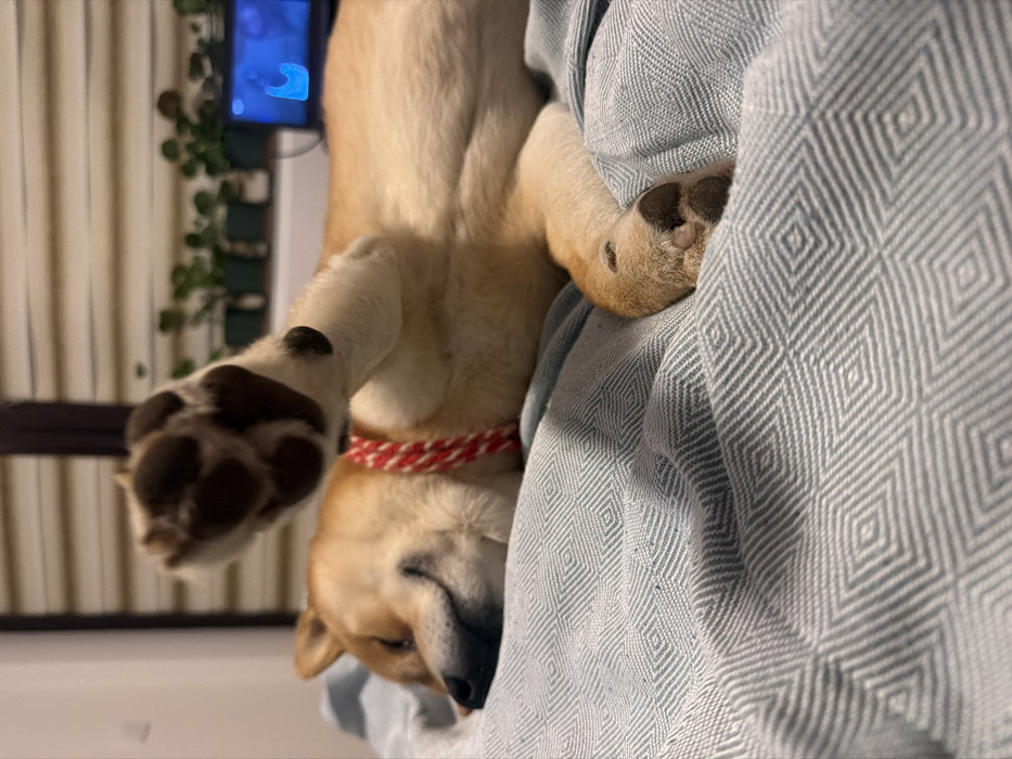 - "A light brown Shiba Inu dog, wearing a red and white striped collar, is depicted lying relaxed on its back or side on a light blue blanket featuring a diamond pattern" by FM-nfS452, licensed under CC BY 4.0