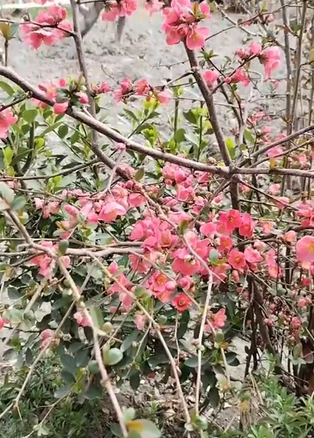 close-up of a shrub with pink flowers. The shrub has many branches, some bare and some with small green leaves. The ground around the shrub is covered in green plants and grass. In the background, there is a blurry image of a light-colored object. The camera moves slightly, focusing on different parts of the shrub and its flowers. The video appears to be taken outdoors in natural daylight.