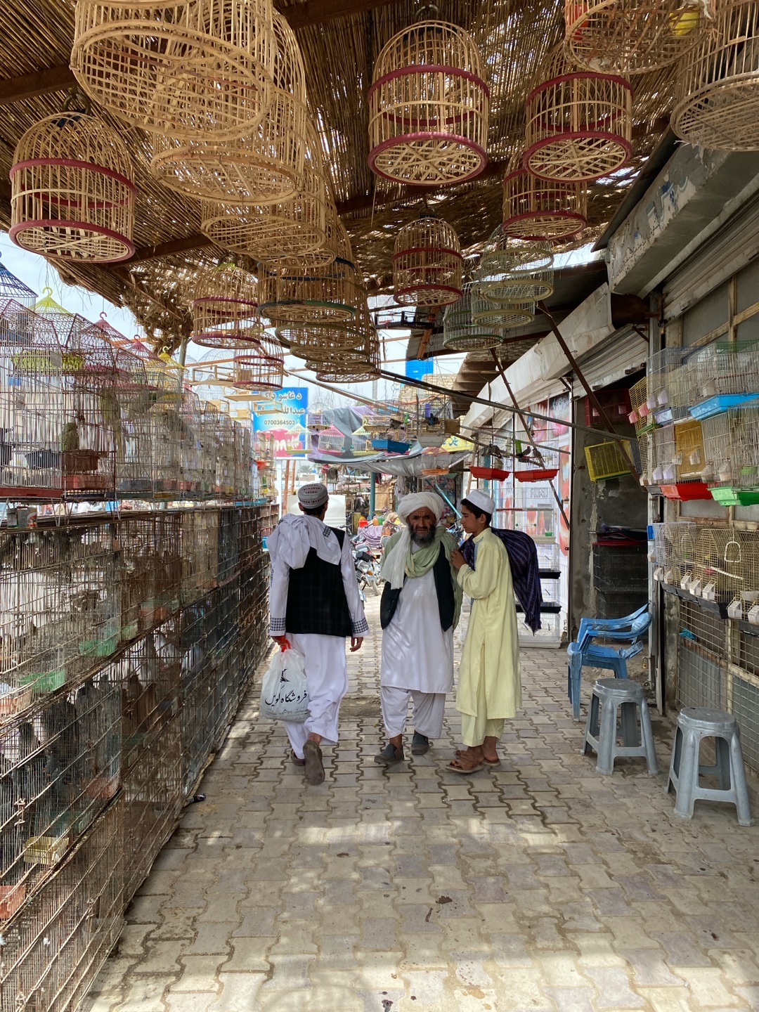 This image depicts a bustling open-air market alley, identified as a bird market in Kandahar, Afghanistan. Overhead, a woven straw canopy provides shade, from which numerous intricately designed, light-colored bamboo or wooden bird cages, many with red trim and mostly empty, are suspended. On the left side of the alley, a tall, multi-tiered rack constructed from metal wire cages holds a dense population of live small birds, likely finches, extending into the background. On the right, a storefront displays smaller, colorful plastic and wire bird cages on shelves, with blue plastic chairs and grey metal stools placed on the paved walkway. The ground is paved with light-colored interlocking concrete blocks. Three men are present on the walkway. The leftmost man, seen from behind, wears a white shalwar kameez and a dark vest, carrying a white plastic bag adorned with black Pashto script. Ahead of him, an older man with a prominent white beard, clad in a white shalwar kameez and a light green or beige scarf, stands conversing with a younger man. The younger man wears a light yellow shalwar kameez and has a dark blue garment draped over his left shoulder. All three men wear sandals or traditional footwear. Further down the alley in the background, additional market stalls and a sign with blue text are visible.