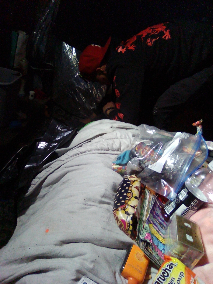 person wearing a red hat and black clothing, with a red design on the clothing, lying down in a dark and cluttered environment. The person is laying on a white blanket, which has a black plastic bag underneath it. There are other items around the blanket, including a small pillow, a plastic bag filled with items, an orange bottle, a yellow and red bag with the words “anuchier” and “soup” on it, a small glass bottle, and other miscellaneous items. The location, based on the coordinates, is Tacoma, Washington.