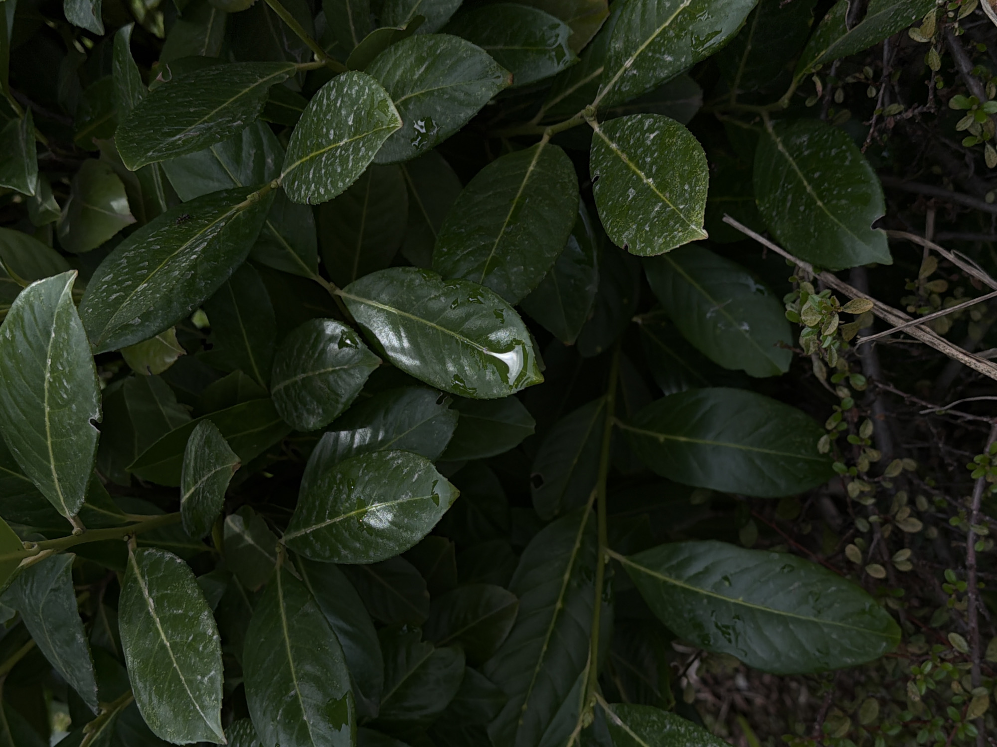 The image depicts a close-up view of a bush or shrub with dark green leaves. Some leaves have water droplets on them. The leaves are oval-shaped with visible veins. Some smaller plants and twigs are visible on the right side of the frame. The lighting is somewhat subdued, casting shadows and emphasizing the texture of the leaves. The setting appears to be a natural, outdoor environment, potentially in a garden or wooded area. There is no information in the image to suggest its location is Parvenets, Bulgaria.