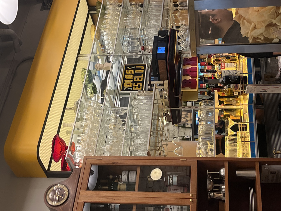 The image depicts an interior scene within a commercial establishment, specifically a bar or restaurant, located in Mexico City, Mexico. The central focus is a well-stocked bar area with multiple tiers of glass shelves displaying numerous clear drinking glasses and stemmed glassware. A large, curved yellow architectural element runs along the top of the scene, above a yellow mesh panel. Various decorative items are interspersed among the glassware, including red, green, and gold bowls, and a small bust. A prominent black sign with white lettering reads "DIOS ES EL DJ" (God is the DJ). Below this sign, an electronic audio component with a blue display is situated on a dark shelf, and a retro-style "BAR" sign with red letters on a cream background hangs beneath it. Below the glass shelves, a counter features numerous bottles of assorted liquor, including Campari, Bacardi, vodka, and other spirits. Two martini glasses are visible on the counter. A wooden cabinet with glass doors is on the left, displaying additional liquor bottles, plates, and bar tools. An antique-style clock rests atop this cabinet. On the far right, a male individual is partially visible in profile, facing rightward. He has dark hair and is wearing a dark uniform. He stands behind a counter where a clear container filled with what appears to be potato chips or similar snacks is prominently displayed in the immediate foreground, partially obscuring him. Reflections of the interior environment and another individual are visible in the polished surfaces of the bar and glass shelving.