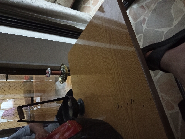 This image depicts an indoor scene in Zamalka, Syria, focusing on a rectangular table with multiple objects and partial views of individuals. The foreground is dominated by a light-brown, wood-patterned table with a glossy, reflective surface. Several small, dark, irregular stains are visible on the left side of the table. On the table's left, a black, footed bowl, potentially containing light-colored granular material, is present. Towards the center-right of the table, the upper section of a hookah (shisha pipe) is visible; it consists of a reddish-brown stem, a metallic ash catcher, and a bowl containing glowing coals on top. On the far left, the torso and right arm of an individual wearing a light-colored, short-sleeved shirt are partially visible. A red bag with gold-colored decorative elements is positioned next to this person. In the bottom right corner, a bare foot wearing a black flip-flop is visible, positioned beneath the table, indicating the presence of another individual. The background features a glass door or large window, through which a patterned curtain or wall is reflected/visible, along with a dark, possibly wooden, crutch leaning vertically. To the right of the glass, a plain, light-colored wall is visible, followed by a drawn, light-colored patterned curtain. The floor, visible beneath and around the table, is covered with irregularly shaped, light-colored tiles with dark grout lines. No direct actions or interactions are explicitly depicted beyond the arrangement of objects and partial views of individuals in a shared space.