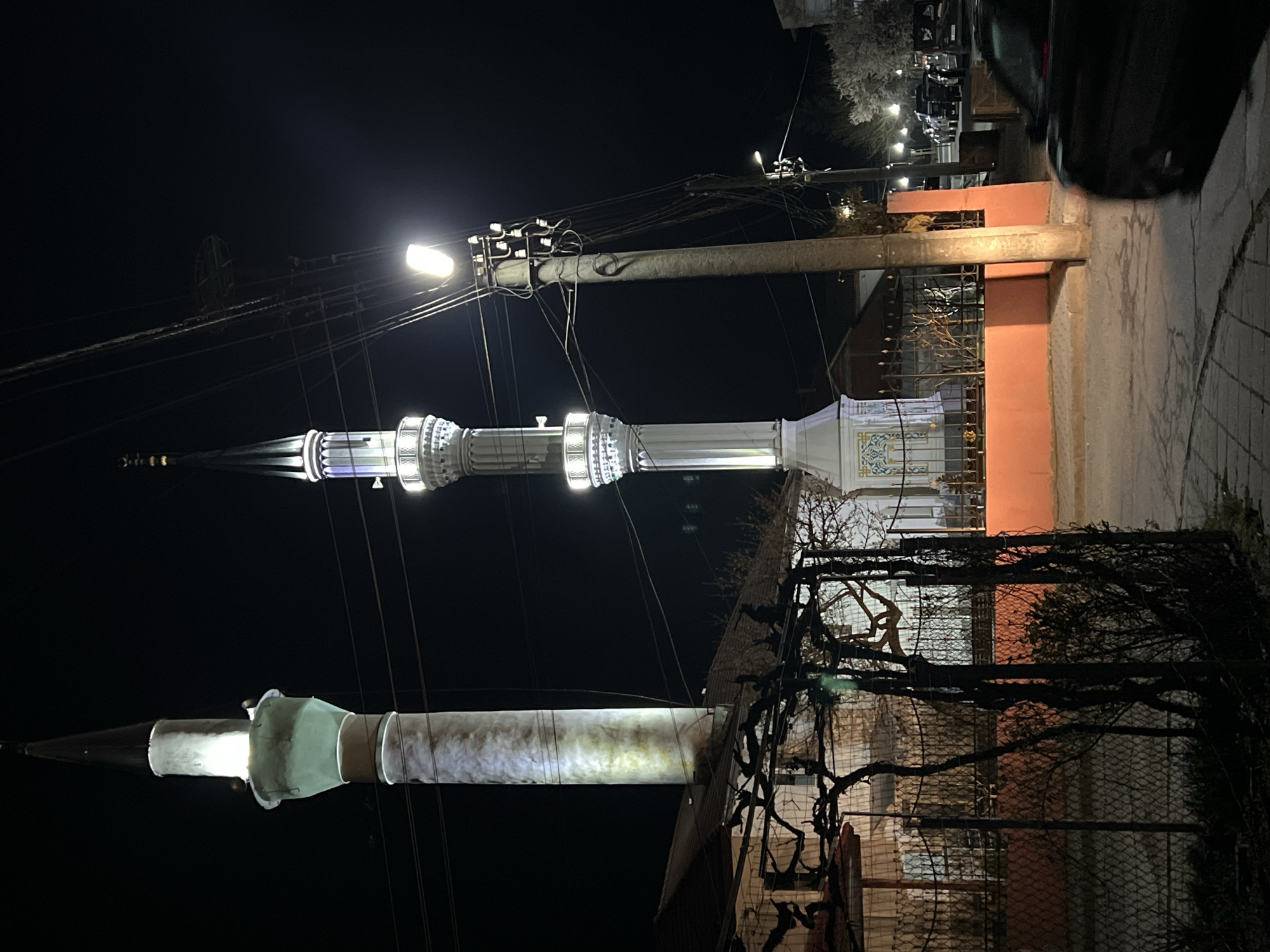 The image depicts a nighttime street scene in Kornitsa, Bulgaria, featuring two illuminated minarets. The scene is dominated by a dark sky, with artificial light sources providing illumination. To the left, a tall, slender minaret stands, appearing to be constructed of light-colored stone, possibly white or pale grey, with some weathering or discoloration. Its upper section displays a greenish tint, and a light source illuminates its top spire. Power lines are visible in front of and behind this minaret. To the right, a second, more ornate minaret stands prominently. This minaret is white, featuring decorative blue and gold patterns at its base and on its balconies. It is brightly illuminated by white lights at multiple levels along its shaft, culminating in a pointed spire topped with a crescent moon and star finial. This minaret is enclosed by a low, orange-red wall and an ornate metal fence. In the foreground left, a chain-link fence is partially visible, behind which a dark, trellised structure with leafless vines or branches is present. The ground in the immediate foreground consists of a cobblestone sidewalk. Further right, a prominent utility pole with a bright, rectangular street lamp illuminates the immediate area, with numerous power lines extending across the frame. Another smaller utility pole with a lamp is visible further down the street. The street itself is paved and appears wet or reflective. Several vehicles are parked along the right side of the street in the background. A dark-colored car, blurred due to motion, is partially visible in the lower right foreground, moving towards the right. Buildings with tiled roofs are discernible behind the left minaret and in the middle distance. No individuals are visible.