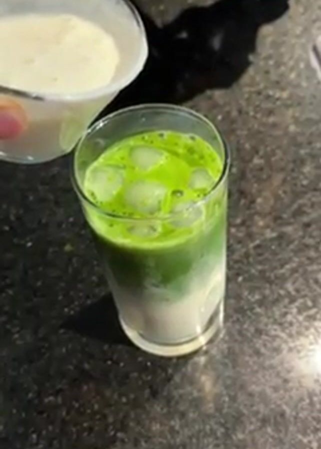 hand pouring a white liquid, possibly milk, from a clear glass into a glass filled with ice cubes and a green liquid on the bottom, sitting on a dark speckled countertop