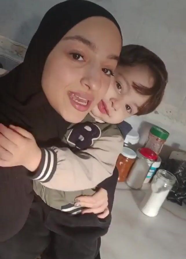 A woman wearing a black hijab is holding a young child in her arms. The woman is smiling and looking at the camera. The child is looking to the side. They appear to be in a kitchen, as there are various jars and containers on the counter behind them and tiled walls in the background. The woman seems to be taking a selfie or a short video with the child. There is lively music in the background.