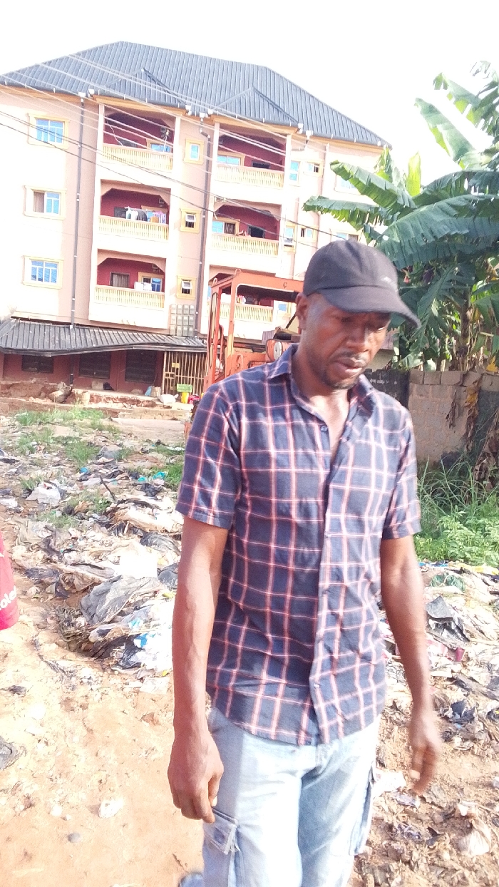 The image displays an outdoor urban environment in Onitsha, Nigeria. In the foreground, an adult male with dark skin is walking from left to right, his gaze directed downwards. He wears a dark baseball cap, a short-sleeved plaid shirt with red and dark blue squares, and light-colored cargo pants. The ground he walks upon is dirt, extensively covered with various items of refuse, including numerous black plastic bags and general litter. To the left of the man, in the midground, an orange piece of industrial machinery, possibly a forklift or similar equipment, is partially visible. Behind this machinery and to the left, a smaller, dark-colored building with a sloping roof is present. The background is dominated by a light peach-colored, four-story residential building featuring multiple balconies with railings on each floor and a dark, pitched roof. Clothes are visibly hanging to dry on a balcony on the third floor of this building. To the far right of the scene, large green tropical leaves, consistent with banana plants, are prominent.