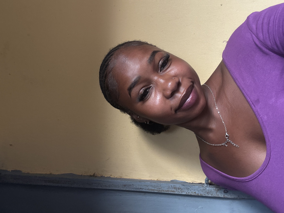 A young Black woman smiles gently at the camera, her head tilted to the right. She has a nose piercing and wears long lashes. Her hair is neatly styled away from her face. A delicate silver necklace adorns her neck. She is wearing a purple top. The background consists of a light yellow wall and a dark gray ledge. The image has natural lighting.