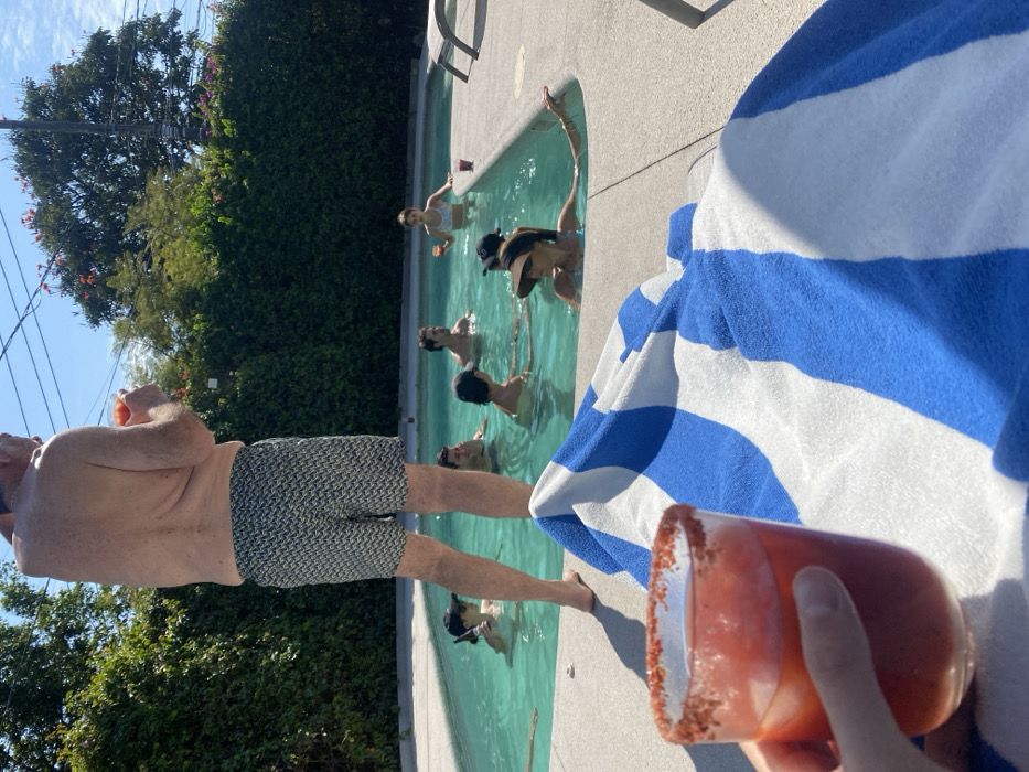 A pool scene features several people swimming. A man in patterned swim trunks stands poolside, near a person holding a salt-rimmed glass. A blue and white striped towel lies nearby. The scene is framed by green foliage and trees in the background, suggesting a sunny day in a backyard setting.