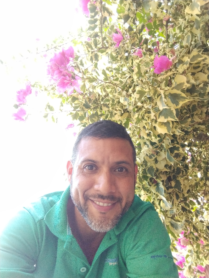 A man with short, dark hair and a graying beard smiles in a selfie. He wears a green collared shirt. Behind him is a vibrant bush with pink flowers and white-edged green leaves. The sunlight is bright, particularly on the left side of the frame. The composition is a close-up, capturing the man's face and a portion of the floral background.