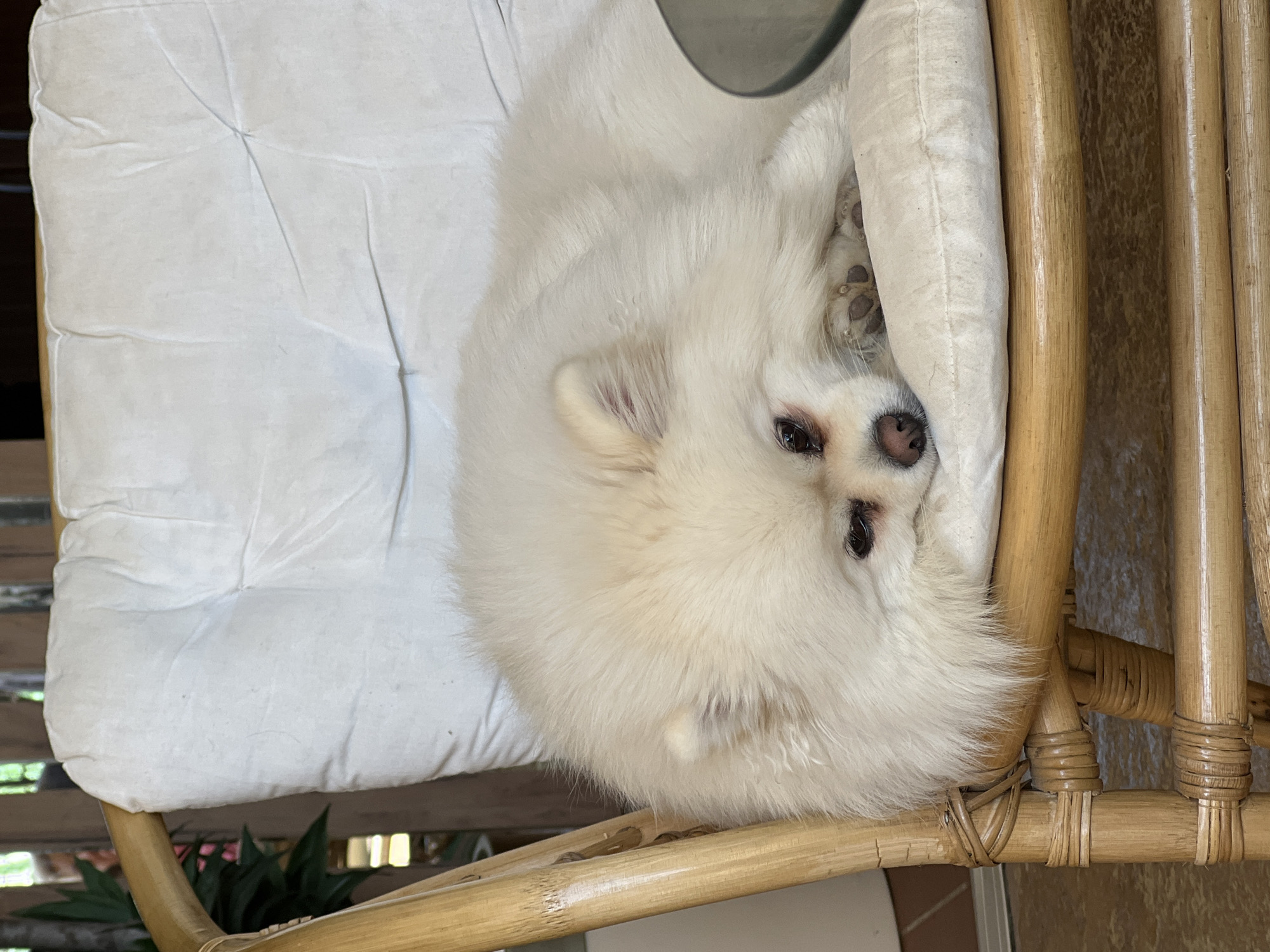 A white Pomeranian dog is curled up on a white cushion placed on a light brown wicker chair. The dog is facing the camera, with its paws tucked under its body. The background is blurred, but hints of greenery suggest an outdoor or sunlit indoor space. The location is not discernible from the image.