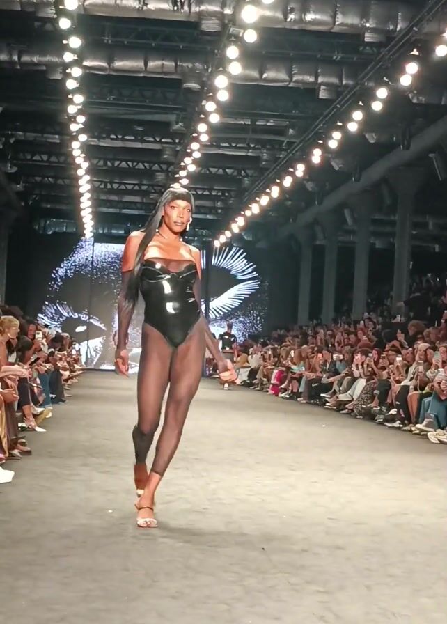 A model walks down a runway during a fashion show. She is wearing a shiny black bodysuit with sheer black tights and matching gloves. Her hair is long and black, and she is wearing high-heeled sandals. The runway is gray and lined with spectators on both sides, many of whom are recording with their phones. Overhead, a series of bright, round lights illuminate the scene. At the end of the runway is a large screen displaying a stylized eye image. The atmosphere is lively with music and cheering.