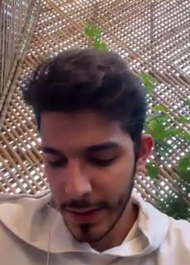 A young man with dark hair and a beard is looking directly at the camera. He is wearing a white hooded sweatshirt and has white earphones in his ears. He puts the earphone into his ear in the middle of the video. The background is a woven pattern. Some green leaves are visible in the upper right corner.