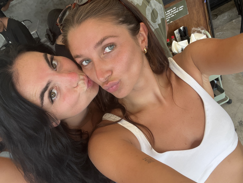Two women in white tops pose closely. The woman on the left has dark hair, green eyes, and puckered lips. The woman on the right has brown hair with sunglasses atop her head, green eyes, and puckered lips. A partial view of a green sign with written text is visible in the background. A portion of a cart with supplies rests on the lower right side of the shot. A partial view of a person in dark clothing is seen on the upper left. A tattoo on the right woman's arm reads "9606".