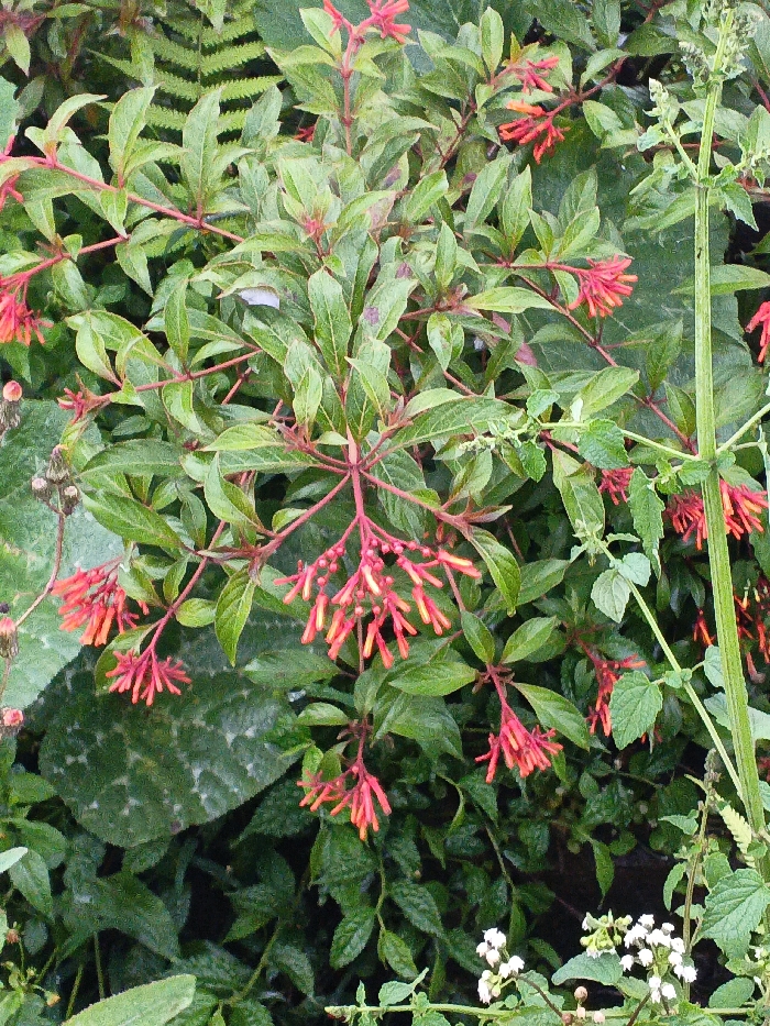 The image displays a detailed, vertical close-up of lush botanical foliage, located in Khan Boeng Keng Kang, Cambodia. The primary subject is a plant bearing numerous tubular flowers, predominantly red-orange, arranged in clusters at the ends of its reddish stems. The plant's leaves are ovate, dark green, and possess discernible venation. Surrounding the central flowering plant, various other green flora are visible. In the upper-left portion, a lighter green, fern-like frond with serrated edges is present. Towards the lower right, a distinct vertical green stem and clusters of small white flowers on a separate plant are observed. The scene is characterized by dense, verdant plant life under natural illumination. No human subjects, actions, or interactions are present.