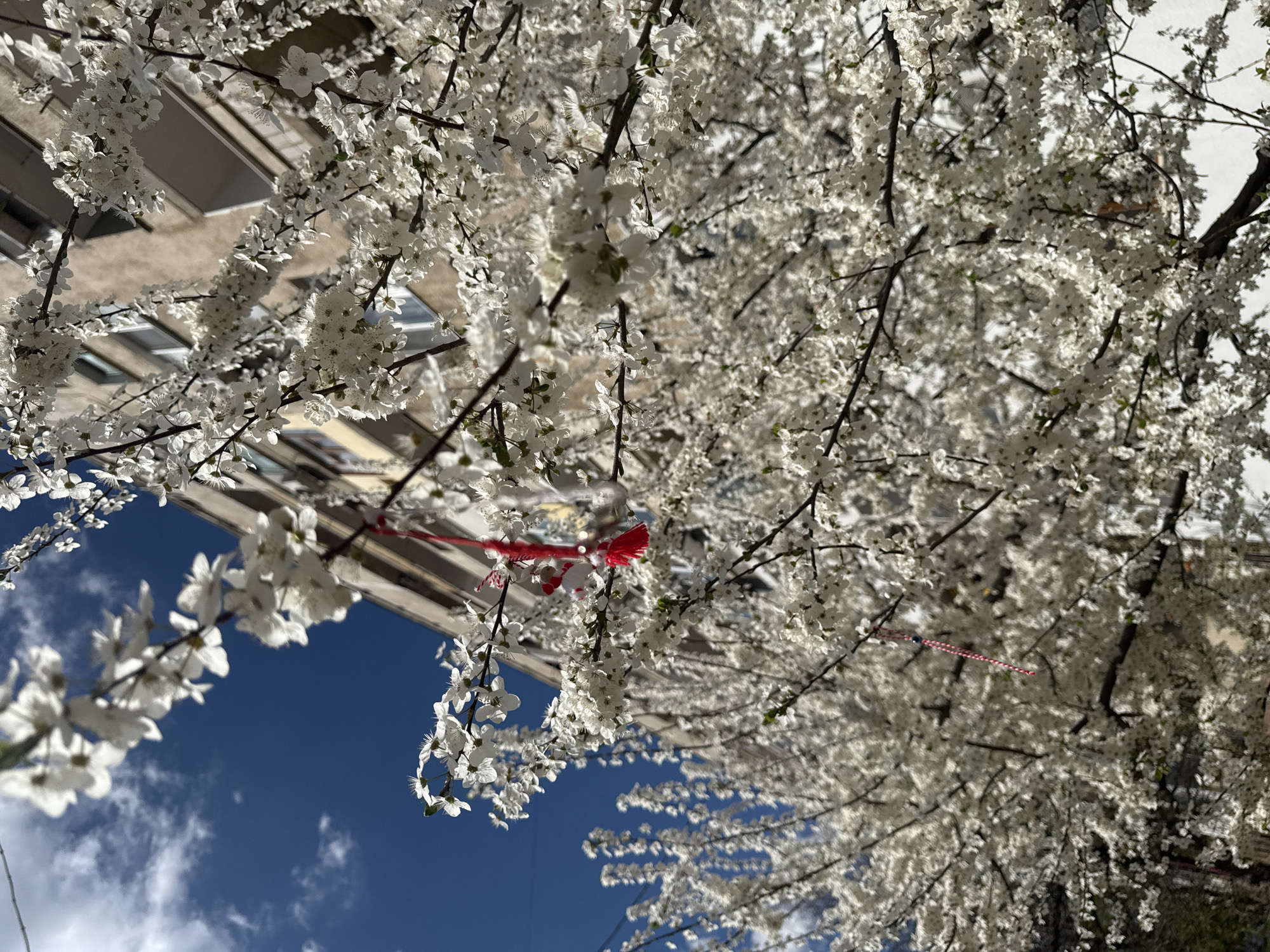 view looking up at a tree in full white blossom, possibly in the city of Vratsa, Bulgaria. The branches are laden with flowers, obscuring the building behind, which appears to be a multi-story structure. Patches of blue sky with white clouds are visible through the branches. Attached to one of the branches is a Martenitsa, a traditional Bulgarian ornament made of red and white yarn, symbolizing health and good luck in the coming year. Another Martenitsa can be seen in the upper part of the image. The time of year is likely early spring, coinciding with the tradition of wearing Martenitsa throughout March.
