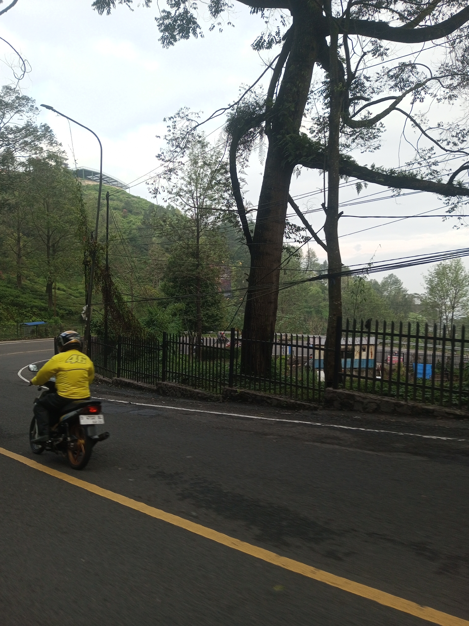 A motorcyclist wearing a yellow jacket with the number "46" on the back is riding on an asphalt road with a yellow dividing line. A black metal fence runs parallel to the road, separating it from a vegetated area with trees. Power lines run along the side of the road as well. The image suggests a mountainous or hilly location, possibly near Taunggyi, Myanmar, due to the vegetation and elevation visible in the background. A building is partially visible on the hill.