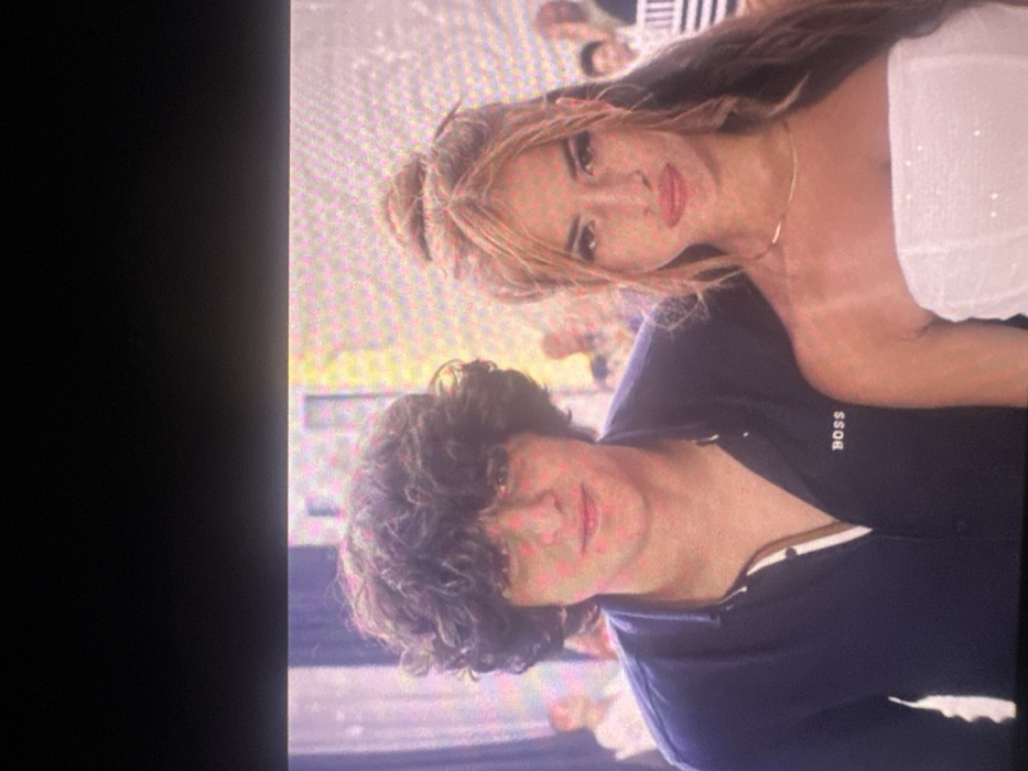 A photograph captures two individuals, a male and a female, posing for the camera in an indoor event setting in the city of Colombes, France. The male, positioned on the left, has dark, voluminous curly hair and wears a dark blue polo shirt with a white placket and a "BOSS" logo stitched on the left chest. He maintains a neutral expression, looking directly forward. The female, positioned on the right, has long, light brown hair styled with some strands pulled back and others framing her face. She wears a white, strapless, possibly sequined, top or dress. A distinct tan line is visible across her left shoulder. She wears a thin, gold-colored choker necklace and has a slightly pouty expression, also looking directly forward. The background is blurred, revealing indistinct figures of other people and elements suggestive of an organized event, such as white chairs or table structures.