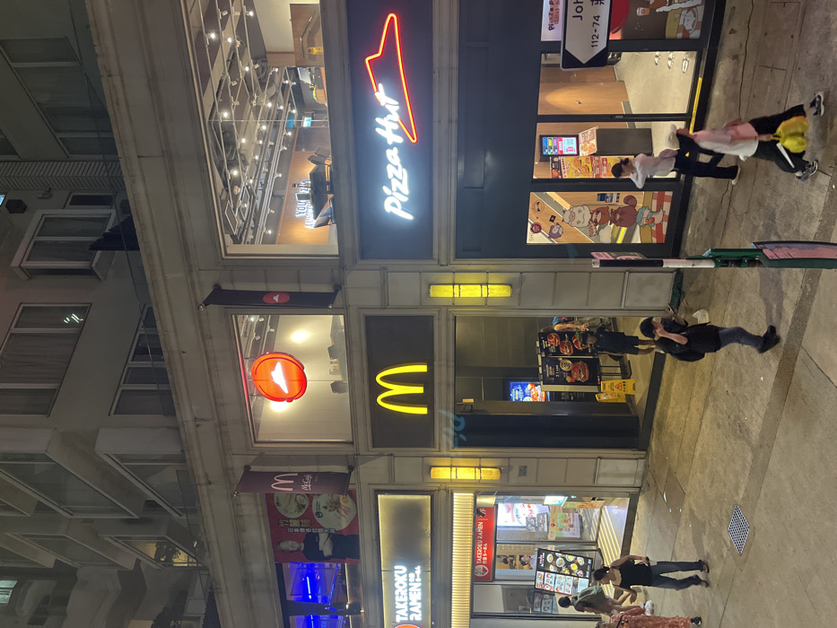 A nighttime street-level photograph depicts a commercial block on Johnston Road, Wan Chai, Hong Kong Island, China. The scene is illuminated by various commercial neon and backlit signs, alongside interior shop lighting. On the left, Takeroku Ramen occupies a storefront, its entrance brightly lit with visible menu displays; two females are positioned near its entrance. Centrally, a McDonald's restaurant is identified by its prominent yellow 'M' logo above the entrance, flanked by vertical yellow illuminated panels. A red 'McCafe' banner hangs to the left of the McDonald's entrance. Above McDonald's, a window displays a circular red Pizza Hut logo, with a smaller red Pizza Hut banner hanging to its right. To the right of McDonald's, a Pizza Hut restaurant features a neon white and red logo spanning its storefront. A white street sign on the far right of the sidewalk points left, displaying 'Johnston Rd' and the address range '112-74'. Approximately seven individuals are visible in the foreground. These include a child within the McDonald's entrance, an adult male with a backpack walking left while looking at a mobile phone, and two females walking right on the far right, one carrying two yellow plastic bags. The multi-story building above the storefronts features numerous illuminated windows.