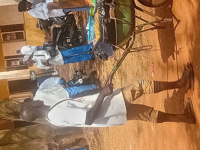 An African man wearing a white shirt and khaki pants pushes a green and black cart down a brown, grassy path. The cart is loaded with goods, including what appear to be peanuts. In the background are other men wearing white shirts and blue pants, some sitting on the ground. A parked motorcycle can also be seen in the background.