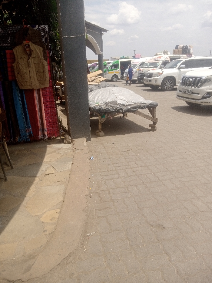 This image captures an outdoor commercial or transit area in Mtito Andei, Kenya, under a partly cloudy sky