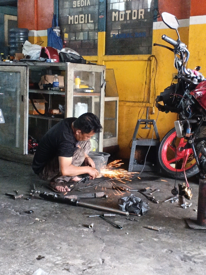 An adult male, identified as a mechanic, is observed squatting on a concrete floor inside a vehicle repair shop in Mekarsari, Indonesia