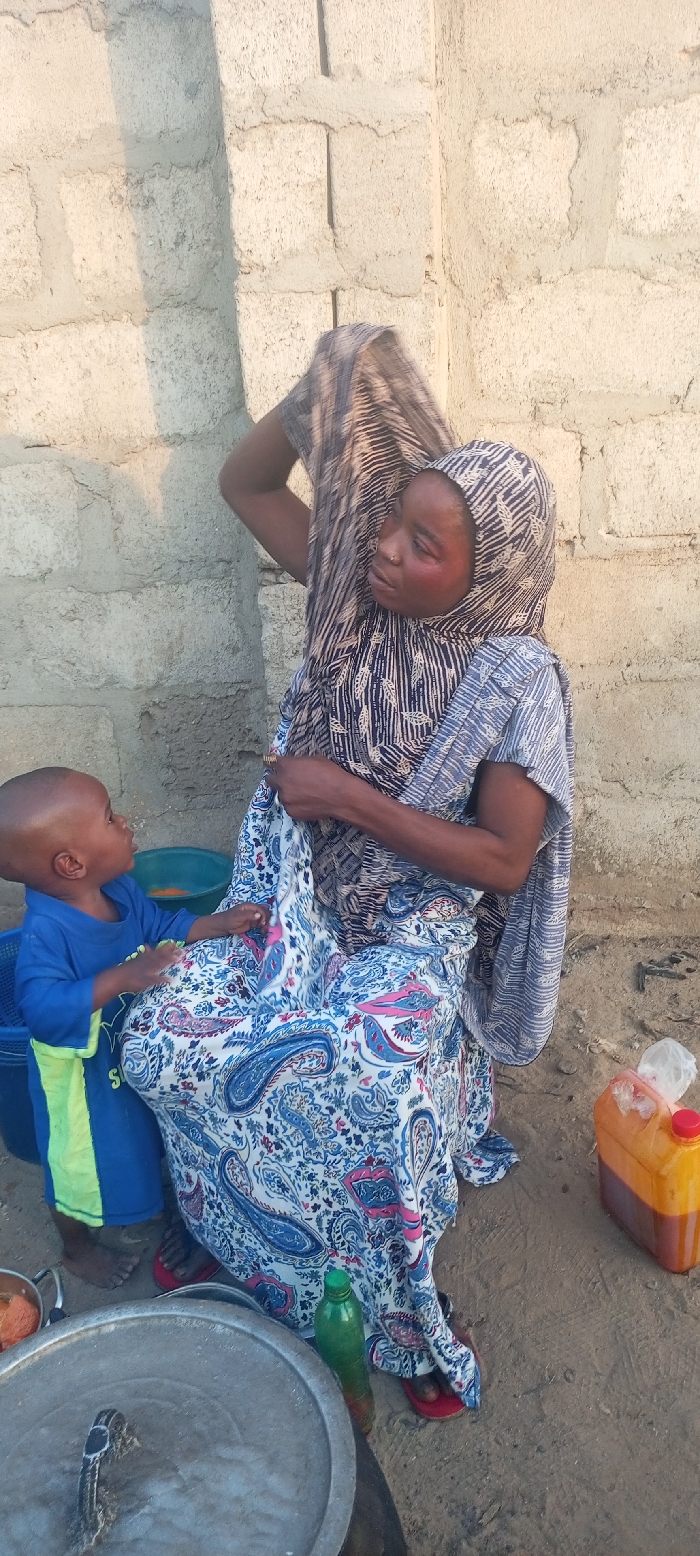 A woman in a patterned headscarf and dress sits outdoors beside a cinderblock wall. She holds a patterned cloth. A young child in a blue shirt stands close to her, looking up. Near the woman's feet are cooking pots, a green bottle, and a container with yellow liquid. The scene appears to capture a moment of everyday life.