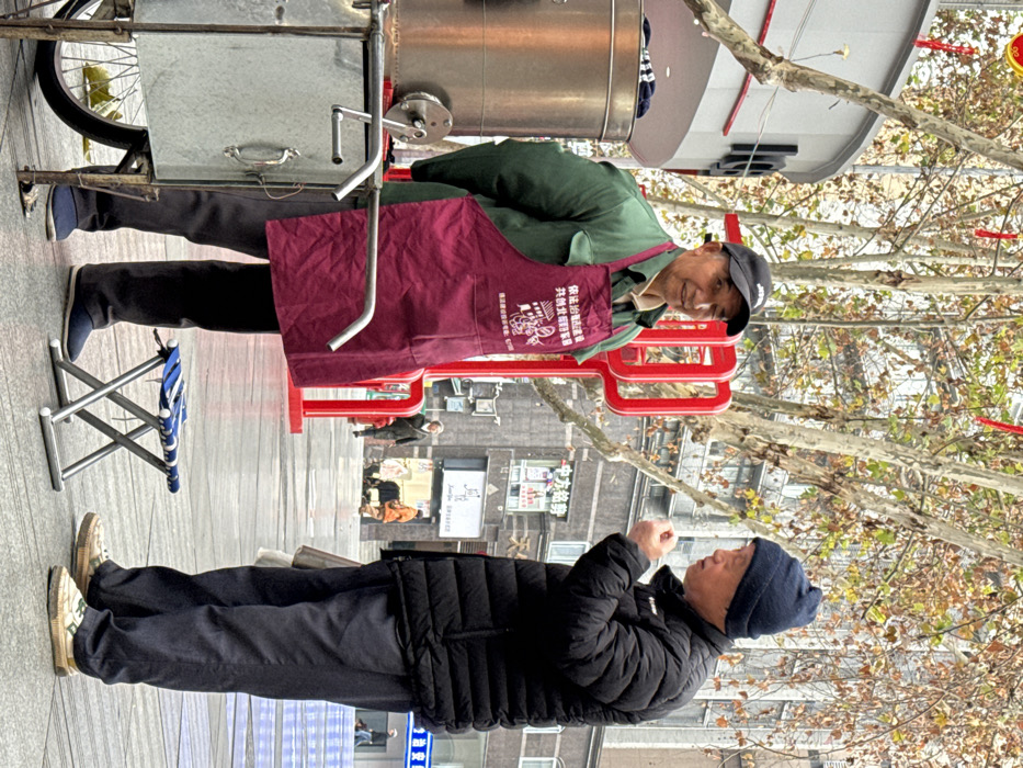 This image captures a street scene in Beibei, China, featuring two elderly East Asian males interacting on a wet, paved pedestrian thoroughfare. On the left, a male vendor wears a black baseball cap, a green jacket, and a maroon apron displaying white Chinese characters. He stands behind a metallic street vendor cart, which includes a prominent cylindrical cooking vessel with a crank mechanism and a lower rectangular storage unit, likely used for preparing food. The vendor is smiling and looking towards the other man. A small, blue-and-white striped portable folding stool is positioned on the ground near his feet. On the right, an elderly male customer or acquaintance wears a navy blue knit beanie, a black puffer jacket, dark trousers, and light-colored sneakers. He is facing the vendor, with his right hand raised towards his mouth, suggesting he is either eating a small item or speaking. The background features deciduous trees with sparse autumn foliage, adorned with red decorative strips or ornaments. Beyond the trees, multi-story commercial buildings with various storefronts and Chinese signage are visible. The ground appears damp, indicating recent rain. Distant pedestrians are also discernible in the background.