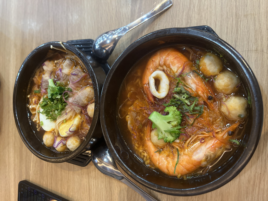 The image displays a close-up, elevated view of two individual servings of hot Vietnamese noodle soup dishes, presented on a light-colored wooden table in the city of Cần Thơ, Vietnam. The upper dish, housed in a black ceramic bowl on a black base, contains a reddish-brown broth. Ingredients visible include sliced meat, several white meatballs, halved hard-boiled eggs, enoki mushrooms, shredded purple cabbage, and chopped green herbs as garnish. The lower dish, also in a black ceramic bowl on a black base, features a reddish-orange broth. This dish contains two large, cooked prawns, several white meatballs, one prominent white calamari ring, a small green broccoli floret, and chopped green herbs. Fine red strands are distributed throughout the broth. Two silver-colored metal spoons are present: one to the left, positioned between the two bowls, and another to the right, adjacent to the lower bowl. A dark-colored smartphone is partially visible in the upper-left corner of the frame, resting on the wooden table surface.