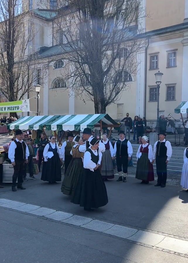 - "A group of about a dozen people, half men and half women, are engaged in a folk dance on a paved street, in front of an off-white building with a prominent dome" by FM-os22t2, licensed under CC BY 4.0