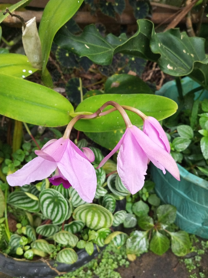 The image displays a close-up view of a dense botanical arrangement, situated in Benshingmo_Jomtsang, Bhutan. Central to the frame are two pale pink orchid-like flowers, each suspended from an arcing stem and exhibiting a deeper magenta coloration in their inner petals. Below these flowers, the foreground is dominated by numerous small, rounded leaves, many of which feature distinct alternating light and dark green stripe patterns. Interspersed are smaller, solid green leaves. In the background, several larger, dark green leaves are present; one leaf in the upper left shows faint white spots, and another further back displays a rippled margin. An elongated, off-white plant sheath is visible near the upper left leaf. Portions of dark-colored and teal-colored plant containers are visible at the bottom left and right edges, respectively. The scene suggests a cultivated outdoor or greenhouse environment. No individuals or animals are depicted.