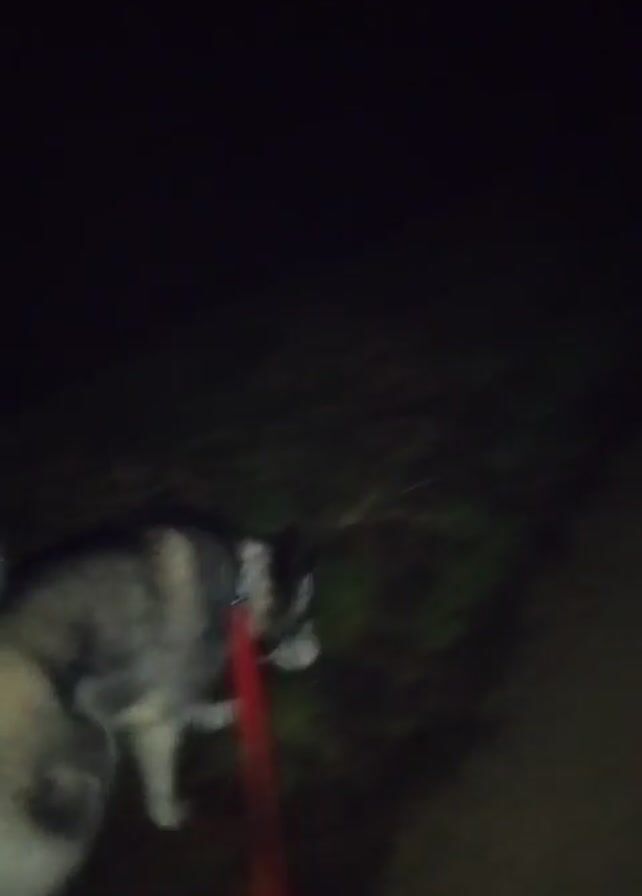dog walking on a leash at night. The dog is a husky with gray and white fur, and it is being walked on a red leash. The video is dark and blurry, but the dog's tail can be seen wagging. The ground appears to be dirt or grass.