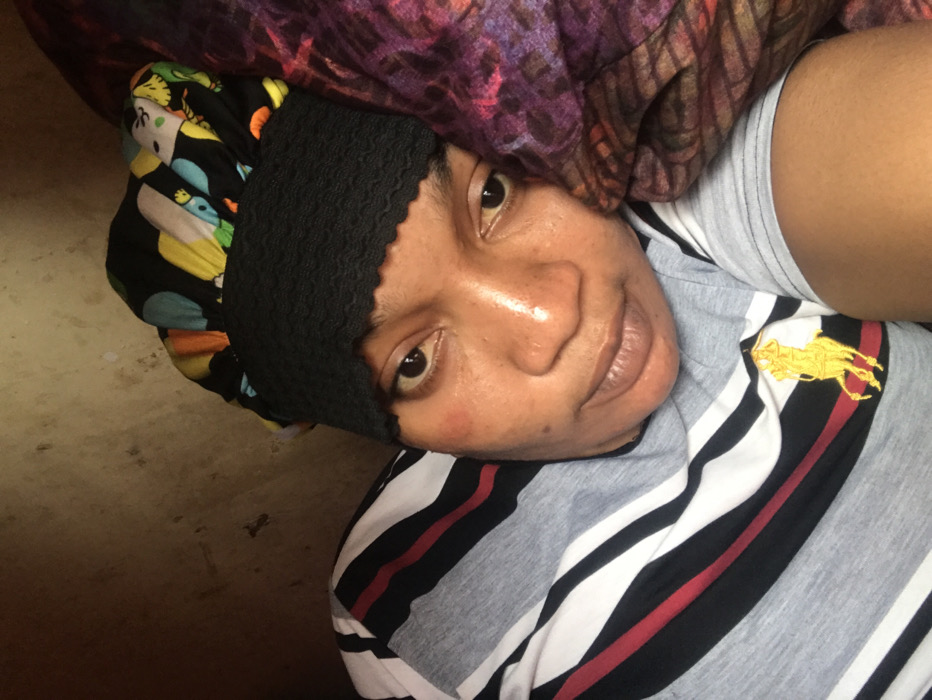 This image, reportedly from Makera, Nigeria, presents a close-up portrait of an individual, positioned from the upper chest upwards. The person has a medium-dark skin tone and faces forward, directly engaging the camera. They wear a multi-colored sleep bonnet featuring black, yellow, orange, blue, green, and white patterns, secured by a black elastic lace band. The individual is dressed in a grey t-shirt with horizontal stripes in white, black, and red, displaying a yellow embroidered polo player logo on the left chest area. The subject's left arm is partially visible on the right side of the frame. To the right and behind the individual's head is a blurred, multi-patterned fabric object, likely a pillow or blanket, featuring hues of purple, red, and orange. The background on the upper left consists of a plain, light brown, textured wall surface. Minor skin blemishes are discernible on the left side of the individual's face. No specific actions or interactions are depicted beyond the subject posing for the photograph.
