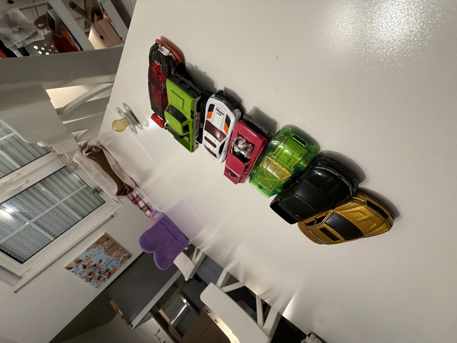A row of toy cars, starting with a dark red car, followed by green, white, red, green, black, and gold cars, lines a white surface. A baby pacifier rests nearby. In the background, a window with white frames is visible, along with a decorative painting and a purple plush object on a shelf. The scene is brightly lit, possibly indoors, and the camera angle is slightly tilted.