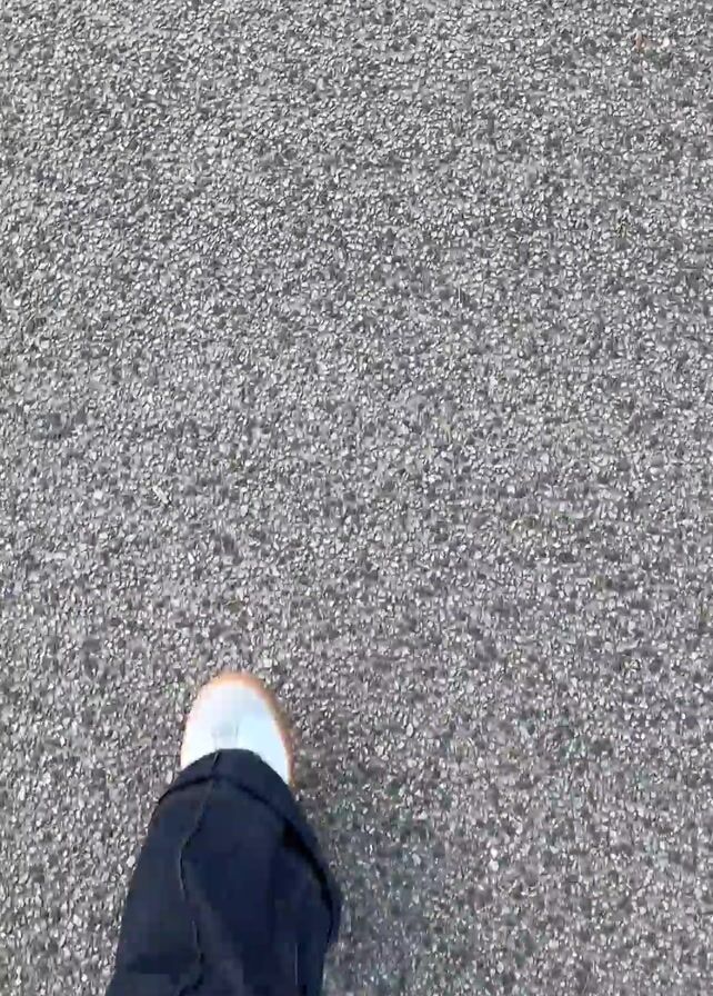 A person wearing dark blue jeans and white sneakers is walking on gray asphalt. The camera is focused on the person's feet and the ground beneath them. The person walks steadily forward. The ground is made of small, light gray pebbles.