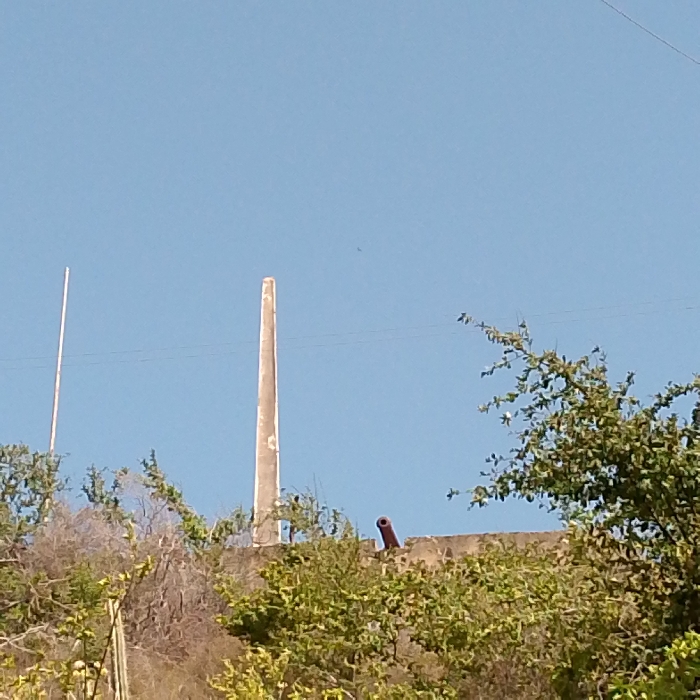 The image depicts an outdoor scene in Pedro González, Venezuela, characterized by clear daylight under a bright blue sky. No individuals are present. In the mid-ground, a tall, slender, light-colored obelisk-like monument stands vertically, showing signs of wear or discoloration. To its left, a thinner, light-colored vertical pole is partially visible. Further to the right of the obelisk, a dark-colored cannon barrel is observed resting on a low, flat, light-colored wall or fortification. The lower portion of the scene, extending into the foreground, is dominated by dense, mixed vegetation, including both green leafy bushes and drier, lighter-toned scrub, partially obscuring the base of the structures. Faint horizontal lines, consistent with overhead power or communication wires, are discernible against the sky between the pole and the obelisk. No discernible actions or interactions are occurring.