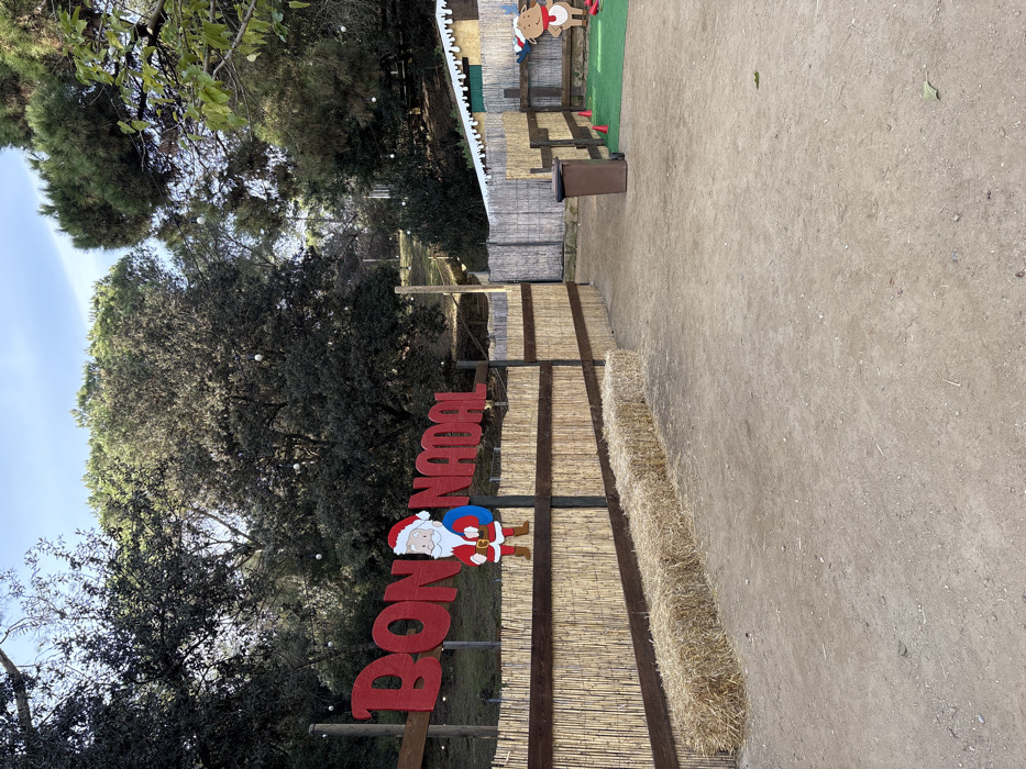 The scene depicts an outdoor festive display in Castellar del Vallès, Spain. A light brown dirt path occupies the foreground and midground. Along the left side of the path, two rectangular hay bales are positioned. Behind the hay bales, a fence composed of dark wooden posts and horizontal beams supporting light-brown bamboo or reed panels extends from the left into the midground. Affixed to the upper section of this fence is a large red sign spelling "BON NADAL" (Catalan for "Merry Christmas"), with a two-dimensional cutout of Santa Claus, dressed in red and carrying a blue bag, situated between the words. The dirt path leads to an opening in the fence system on the right. Immediately to the right of this opening stands a brown, lidded trash receptacle. Adjacent to the trash bin, a small enclosed area with a similar bamboo-paneled fence features artificial green turf, a red reindeer cutout figure, and several small orange cones. The background consists of a dense, natural treeline featuring various species of trees. Numerous spherical white lights are visibly strung among the tree branches and across the upper portion of the scene. No individuals, actions, or interactions are depicted.