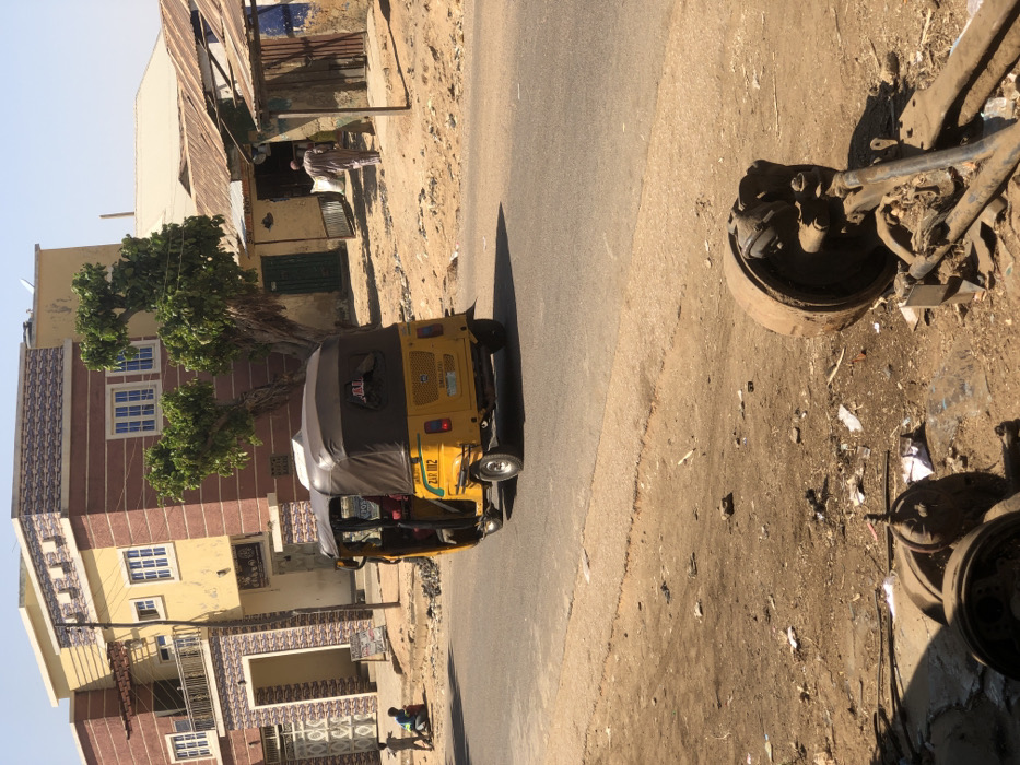This image captures a street scene in Kufena, Nigeria, under clear, bright daylight. In the immediate foreground, a dry, light brown dirt ground is strewn with miscellaneous litter and two prominently displayed, rusty automotive axle assemblies or brake drum units. The midground features an asphalt road where a yellow three-wheeled motorized rickshaw, commonly known as a "Keke Napep," with a dark brown canopy, is traveling away from the viewer towards the right. The vehicle displays "ZAR 112" on its rear. To the left of the road, on a dirt shoulder, two individuals are visible; one stands upright, while another, wearing a blue shirt, crouches next to a red object on the ground. Further down the street on the right, a single individual in a light-colored traditional garment walks away from the viewer amidst dry earth and sparse debris, heading towards the background structures. The background consists of diverse urban architecture. On the left, a two-story building with a light yellow facade and reddish-brown patterned sections features multiple white-framed windows and a balcony. A utility pole stands vertically in front of this building. Centrally, a large, leafy green tree separates this building from simpler structures on the right. These structures appear to be single-story, less maintained buildings with corrugated metal roofs, some exhibiting remnants of paint and a green door. The sky above is clear and light blue.
