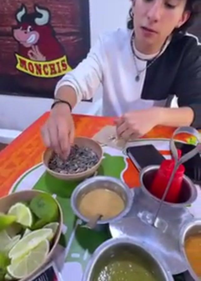 A young man with curly brown hair is sitting at a table eating sunflower seeds. He is wearing a black and white sweater and a beaded necklace. On the table are bowls of limes, sunflower seeds, and three different sauces. There is also a bottle of ketchup, a cell phone, and a menu. Behind him, on the wall, is a banner with a cartoon bull wearing a cowboy hat and the word "Monchis" written on it. The man looks up and smiles at the camera.