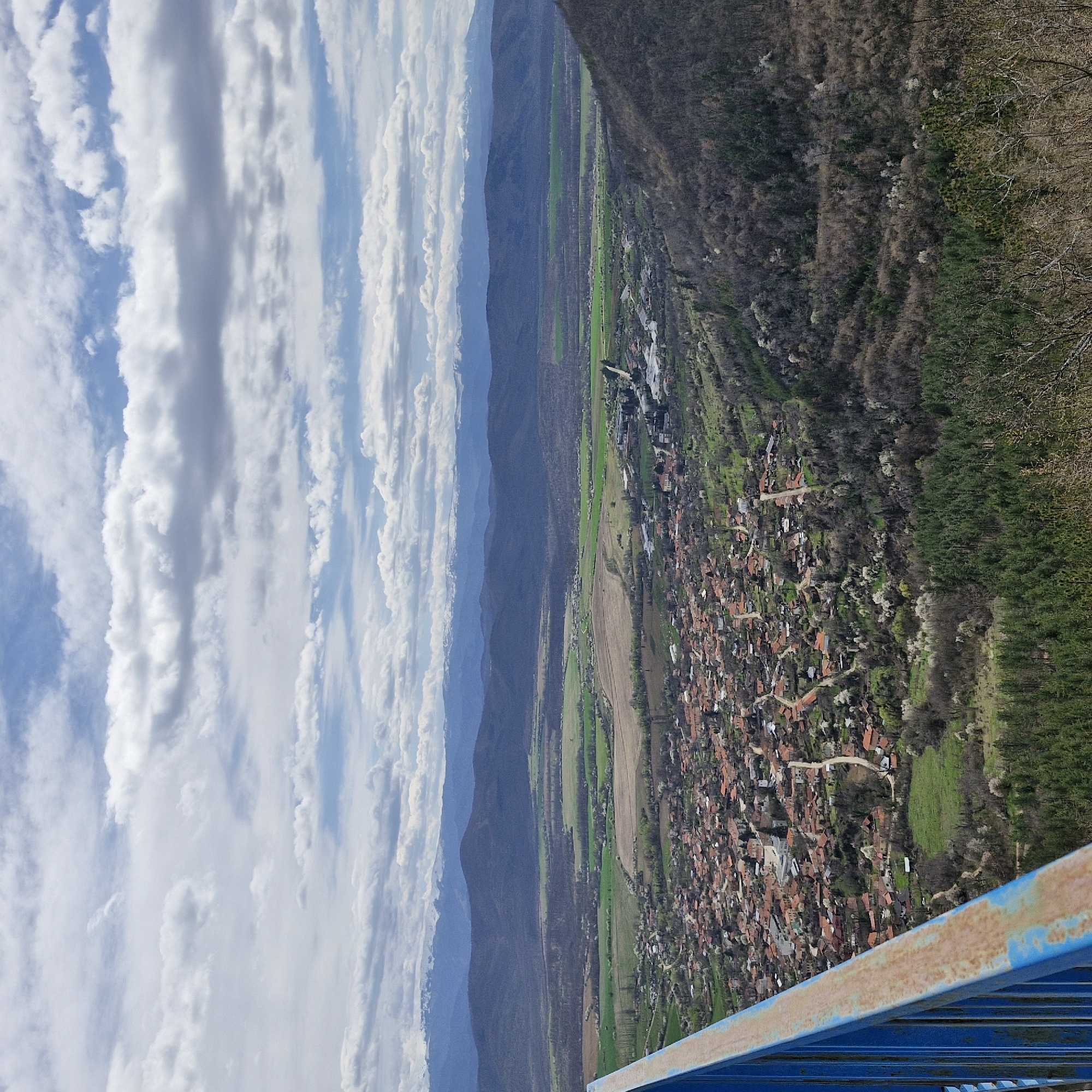 view from an elevated position, possibly a bridge or overlook, in Vrabevo, Bulgaria. The foreground contains a blue metal railing, showing signs of wear and rust. Below is a sprawling settlement with red-tiled roofs, interspersed with trees and green fields. A dense forest borders the settlement. Beyond the settlement, there's a valley with agricultural fields. In the distance, there are mountains under a sky filled with textured clouds.