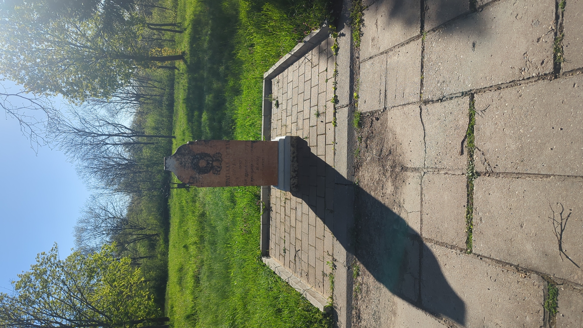 monument dedicated to Bratya Kan Sofiyski, located in the city of Dobrich, Bulgaria. The monument is made of stone and features an inscription in Cyrillic script. It stands on a paved area surrounded by grass and trees. The monument casts a long shadow on the pavement. The overall scene is outdoors on a sunny day.