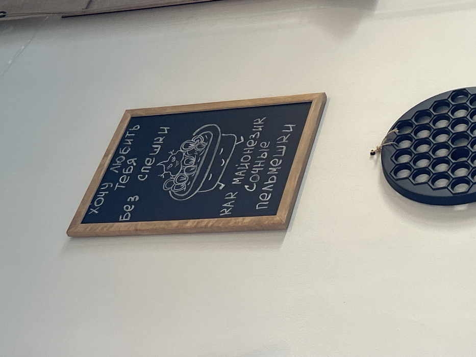 The image displays a white wall in Agryz, Russia, featuring a rectangular chalkboard sign with a light brown wooden frame