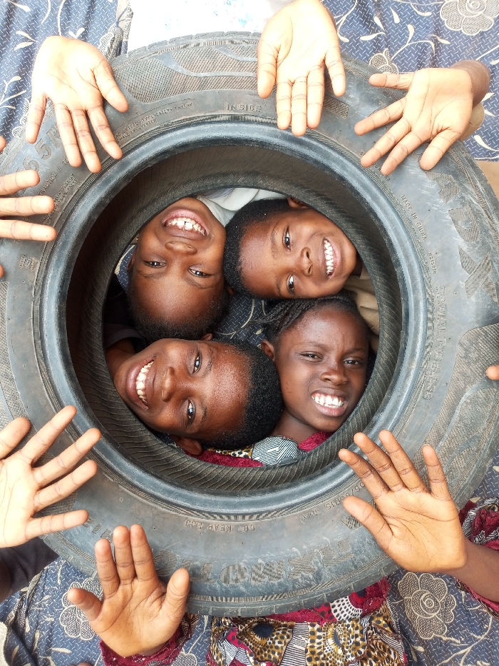 An overhead photograph depicts four children's faces positioned within the central aperture of a dark, worn vehicle tire