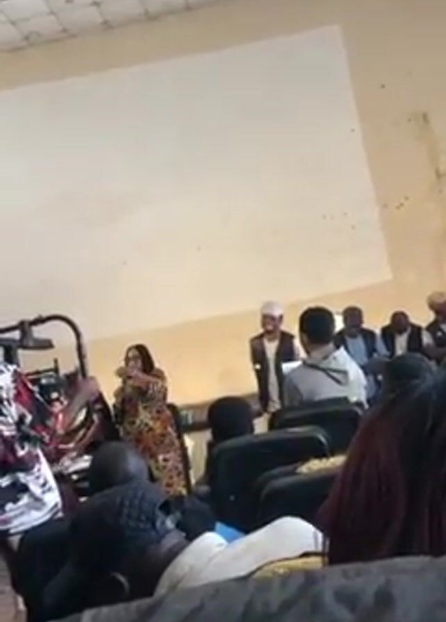 The scene shows an indoor gathering, possibly a lecture or meeting, with a woman in a colorful dress speaking to an audience seated in rows of black chairs