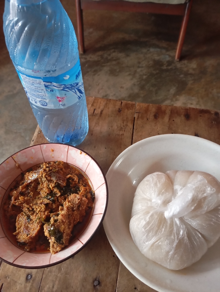 - "The scene depicts a meal laid out on a rustic wooden table in an indoor setting within Okere-Urhobo, Nigeria" by FM-JEKAG3, licensed under CC BY 4.0