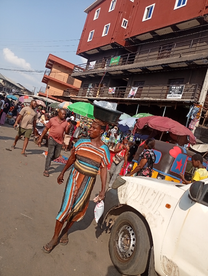 A bustling street scene depicts a crowded marketplace with pedestrians and vehicles. A woman with a basin atop her head walks towards the camera, passing by a white vehicle with visible damage. Behind her, various vendors are under umbrellas, while other people are walking. Buildings rise in the background, with a distinctive brown structure having numerous windows. The overall atmosphere suggests a vibrant, busy urban setting.