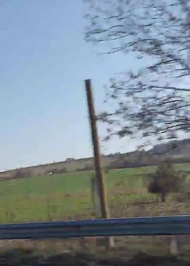 view from a moving vehicle, likely a car, traveling along a road. The scenery consists of a green field beyond a fence and a guardrail. There are bare trees visible at the start of the video and utility poles that pass quickly by. The sky is clear and blue. Another dark colored car passes by at the end of the video.