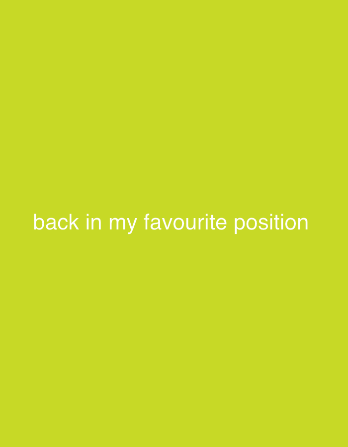 The image presents a uniform, solid lime green background. Centrally positioned in the lower-middle section of the frame is white sans-serif text that reads "back in my favourite position". No individuals, subjects, objects, actions, interactions, or environmental features are depicted. The visual content provides no discernible information regarding a specific physical location, therefore no location within the city of Tunbridge Wells, United Kingdom, can be identified from this image.